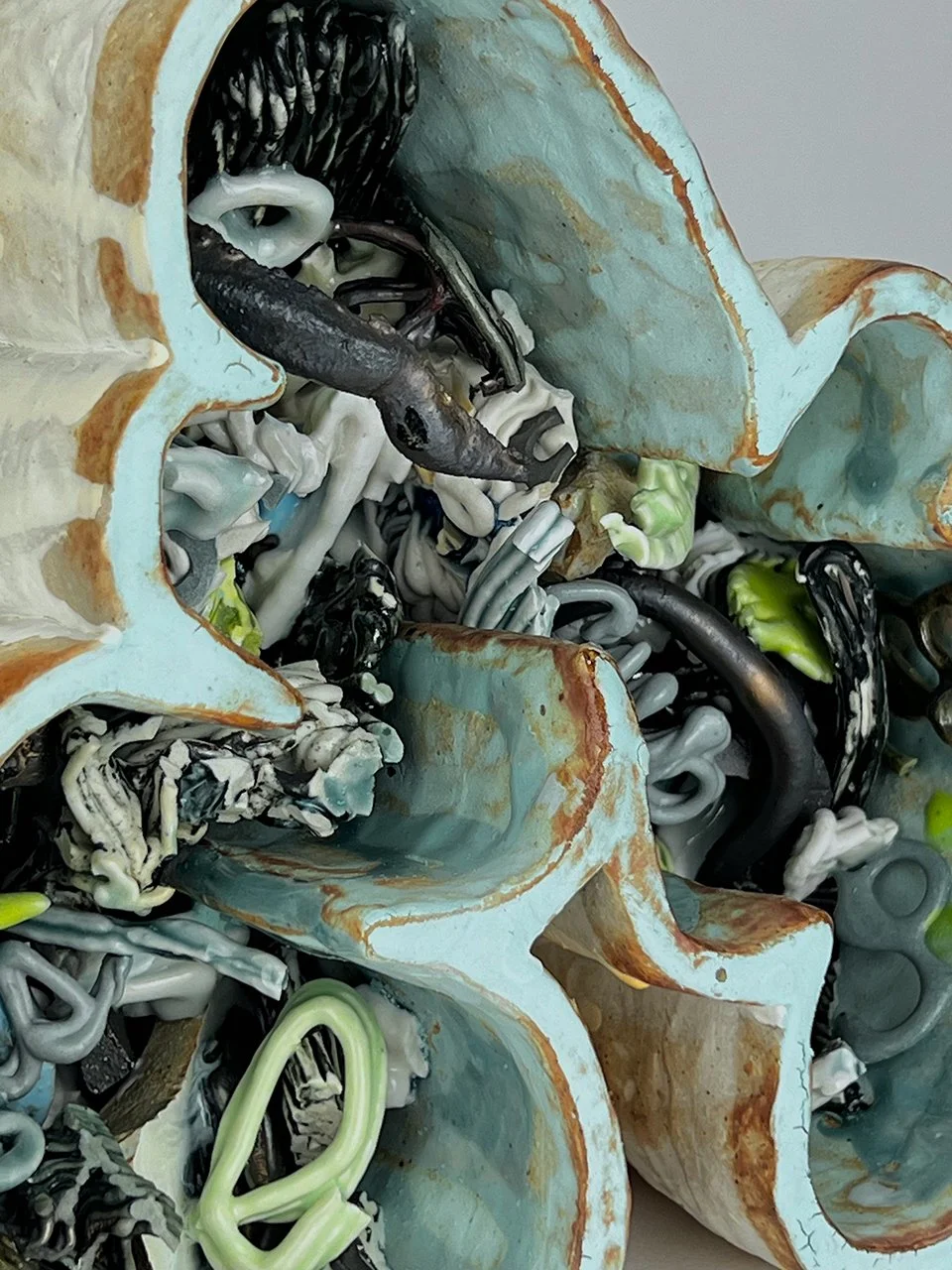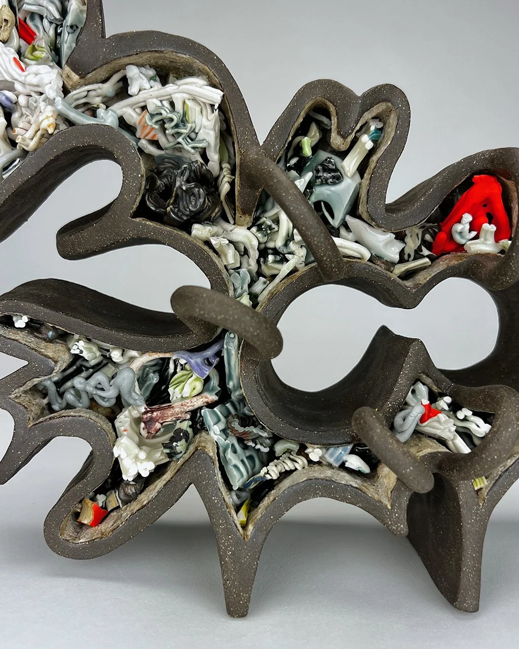 Words are elastic and slippery. Technology is fluid. Economy is viscous. Epistemology is fragile and tangled. Clay can be all of these. Derived from phrases that resonate on a personal and socio-political level, these sculptures are made by hand. I will start with something like “soft power,” writing it out in script, outlining it, and using that shape as the foundation for a vessel. This form is then built upon or filled with fragments of broken, failed or unused past pieces - perhaps reflecting a more visceral construction of understanding or memory than legible language offers. Many of these shards were initially created via slip trailing, an historic pottery surface design process that I have inverted to build with structurally. This practice is akin to 3d printing, but it is important that I manually and directly manipulate the liquid clay - line by traced line - to imbue a sense of the human and neurotic through touch.